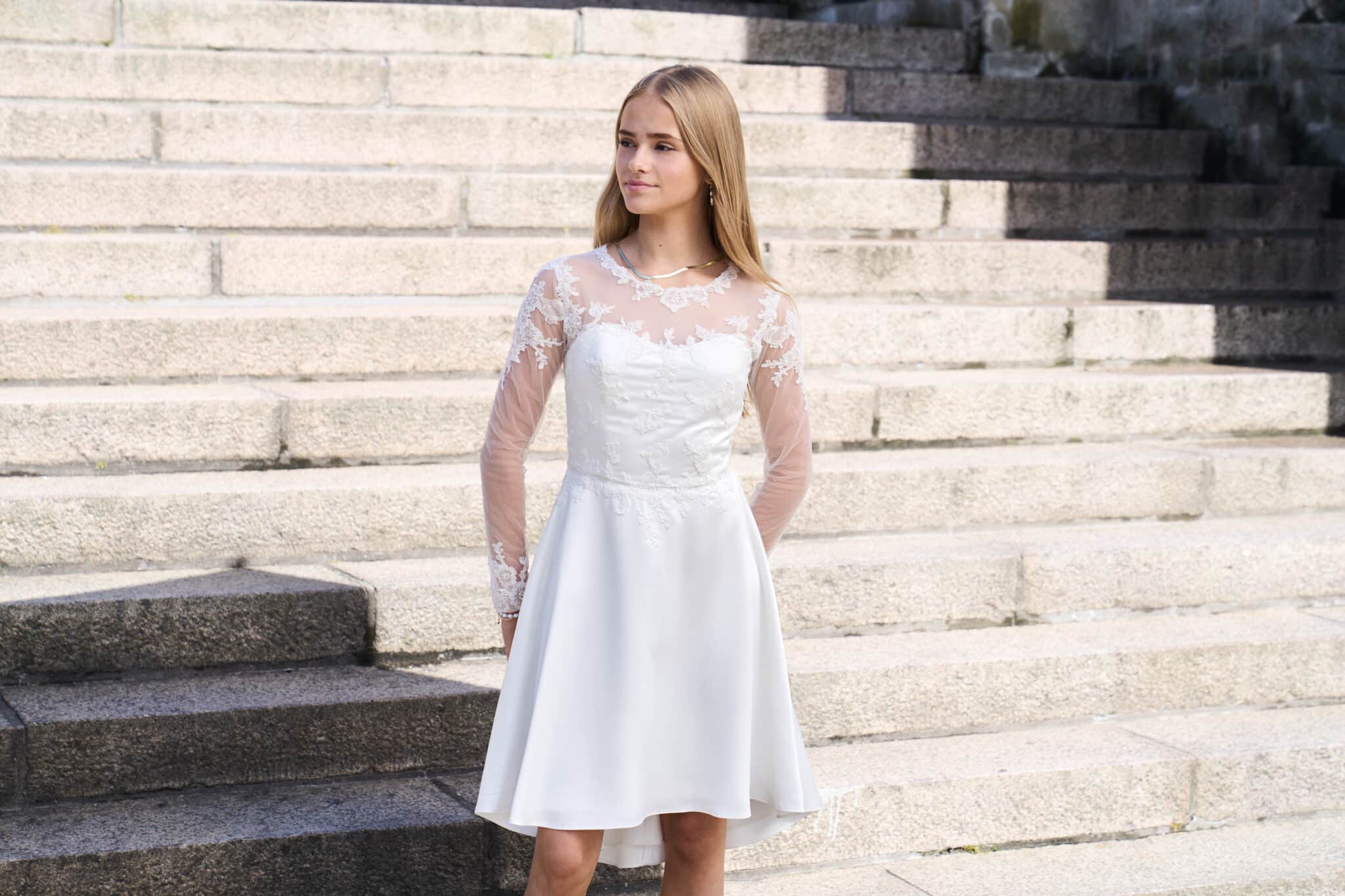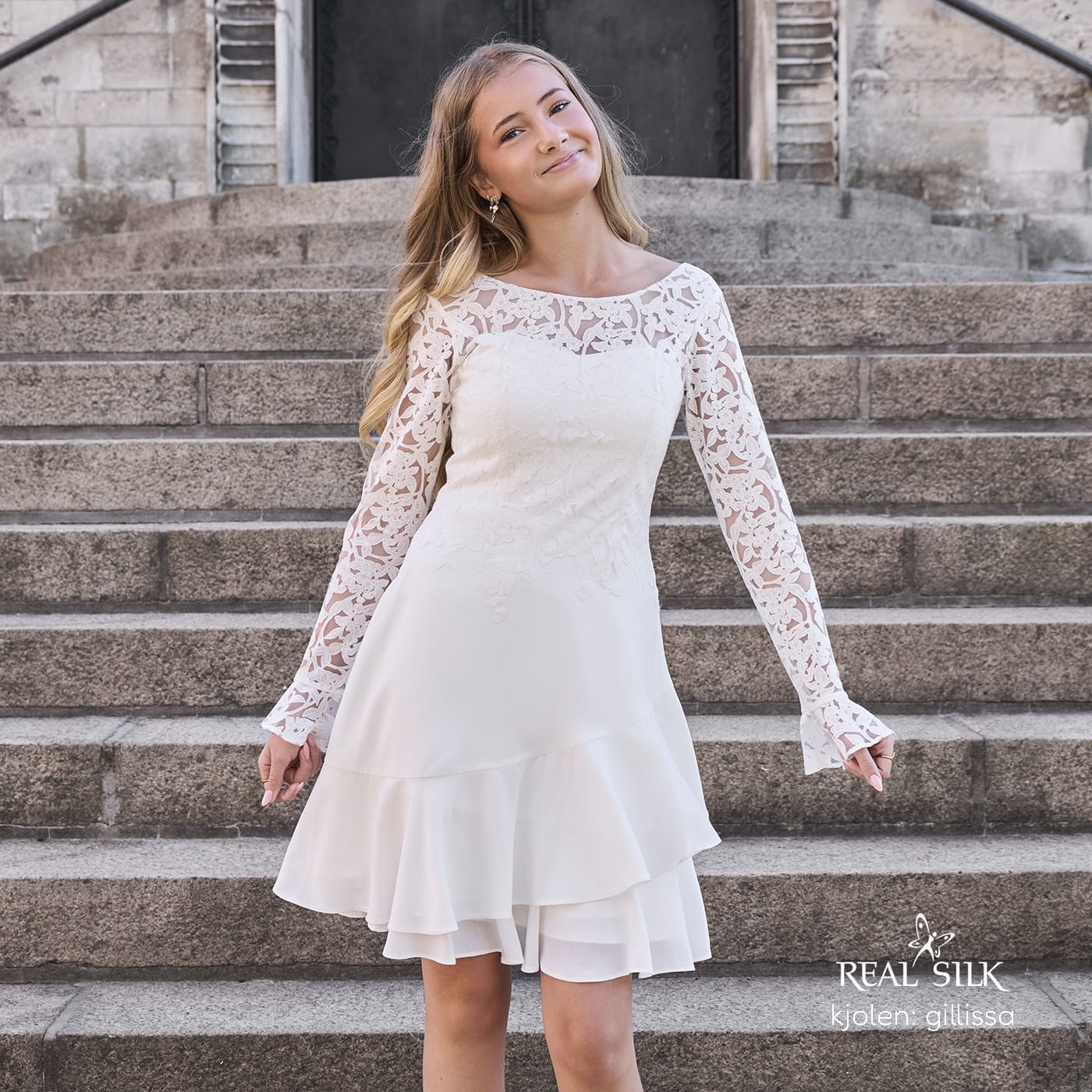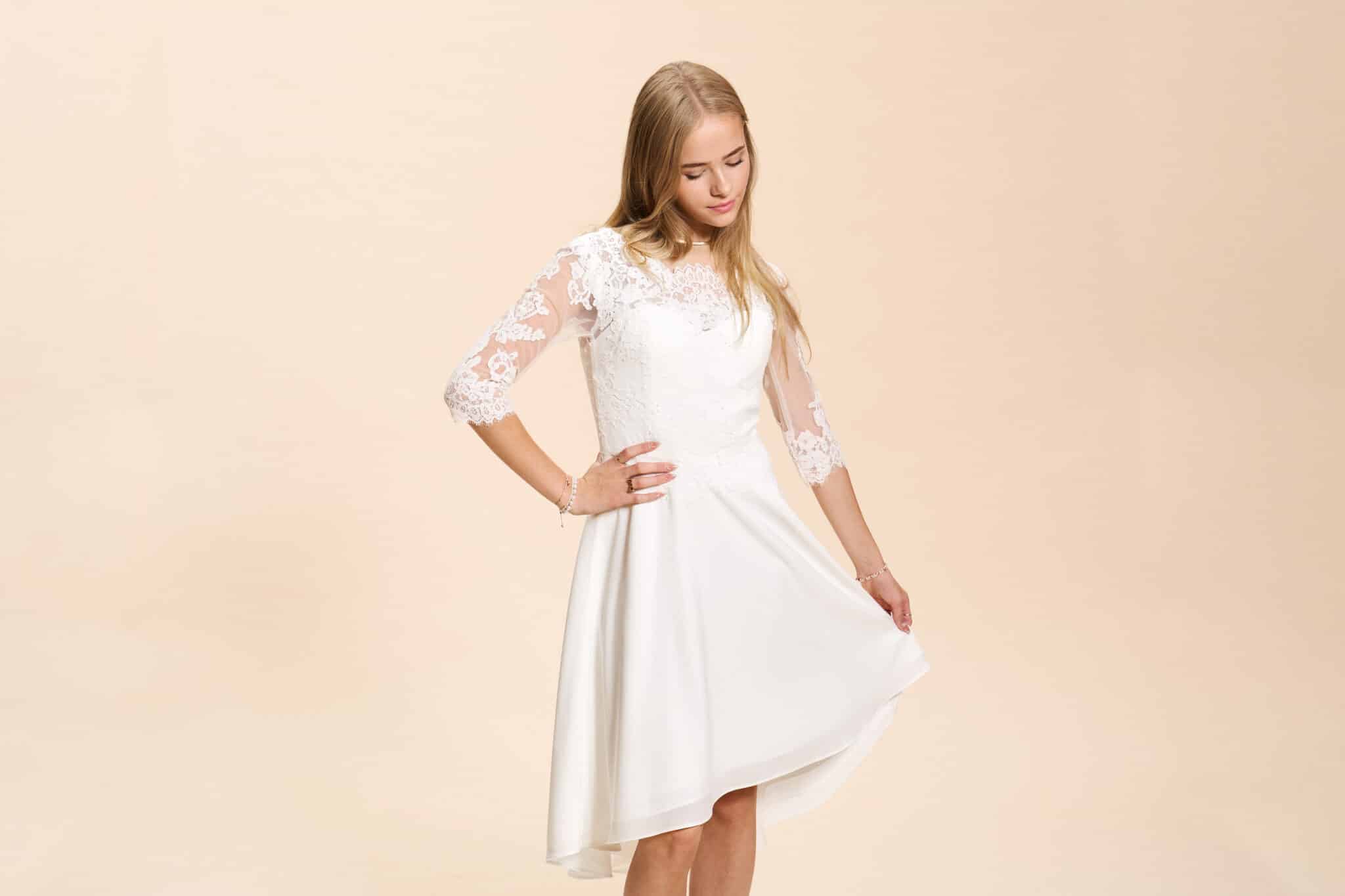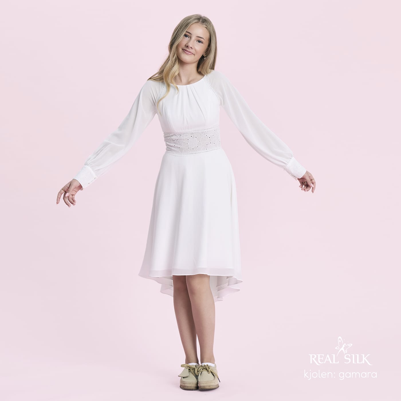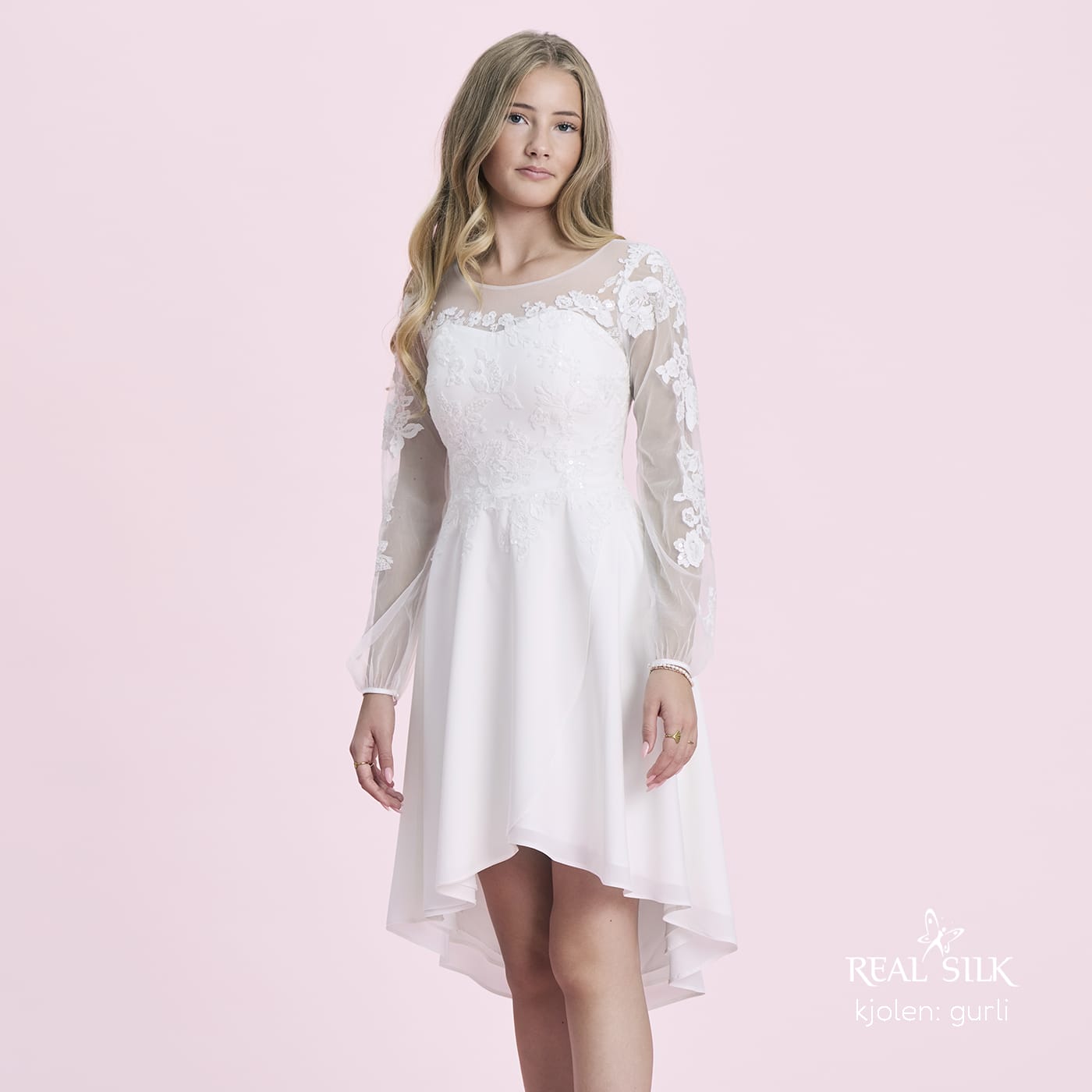 Vi tilbyder både konfirmationskjoler fra Real Silk, og skræddersyet konfirmationskjoler.