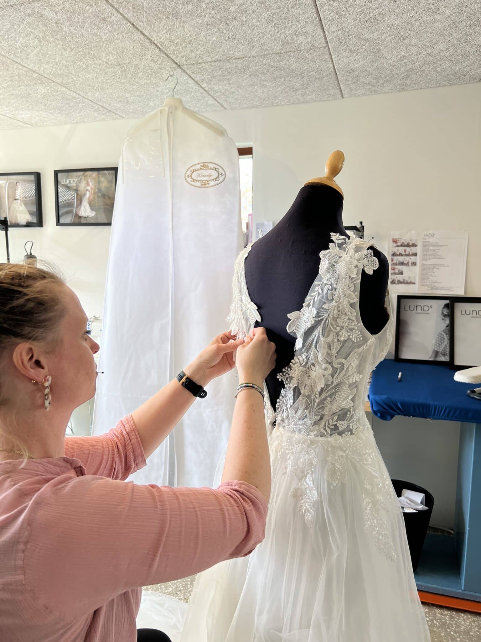 - Tilretning af brudekjoler er vores helt store speciale. Både jeg og min medarbejder har mange års erfaring indenfor tilretning af brudekjoler og festkjoler.